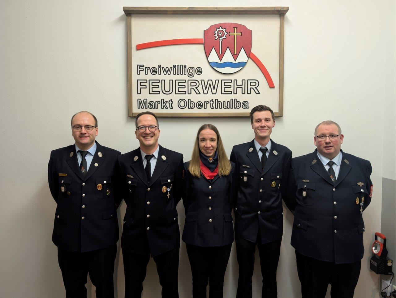 Von links: 1. Kommandant Lukas Zwecker, Löschmeister Florian Haas, Oberfeuerwehrfrau Sandra Gigla, Oberlöschmeister Jan Stürzenberger, 2. Kommandant Matthias Zwecker - Bild 5: Aktive Ehrung